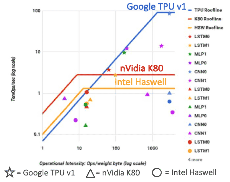 The graph above is featured in a paper published by Google a couple of years ago detailing the first-generation Tensor Processing Unit (TPU). It’s a very insightful paper, because it compares the performance of Google’s TPU against two other processors. You can see three different Rooflines in the graph above: one in red, one in gold and one in blue. The blue Roofline represents the Google TPU, a special purpose-built piece of silicon that was specifically designed for AI inferencing. The NVIDIA K80 – a GPU designed to handle a larger class of operations – is in red. Represented in gold is the Roofline for the Intel Haswell CPU, a very general-purpose processor.
