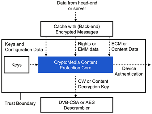 Designed to cost-effectively secure the broadcast and streaming of digital content, our CryptoMedia Content Protection Core provides pay TV operators and over-the-top (OTT) media providers robust security against security threats, like side channel attacks, through a hardware root-of-trust embedded directly in the device multimedia chipset. The core enables a cardless solution that is compatible with existing conditional access systems (CAS) and digital rights management implementations.