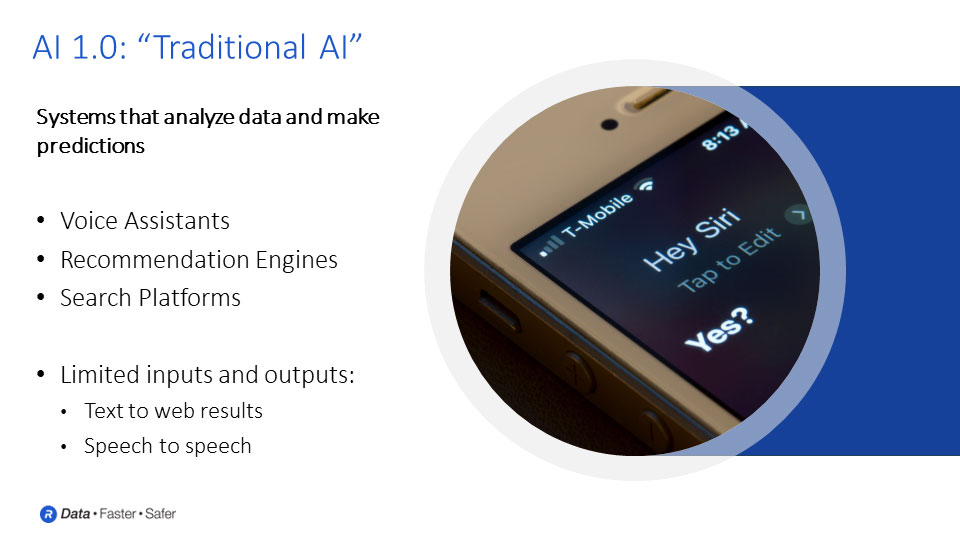 AI is a huge part of our everyday lives. If you have asked your home assistant for the weather, used a search engine, or been recommended something to watch today, then that has all been AI 1.0 discretely at work. While these AI-enabled applications represent notable advancements in incorporating intelligence into systems, they do have a limited set of inputs and outputs. For example, you can use speech to output speech or text to output text. They are systems that analyze data and make predictions, without creating anything new in the process.